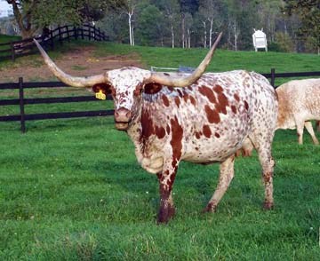 Hubbells Miss Judy is a corner stone of herd. Her full brother is Gunsmoke of Lazy L Longhorns. Her dam, Delta Judy, had 70 inches tip to tip. Miss Judy has a bull calf at side by El Presidente.